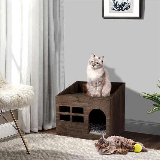 Wooden Cat Cave Bed with Cushion Pad and Litter Box for Indoor Cats